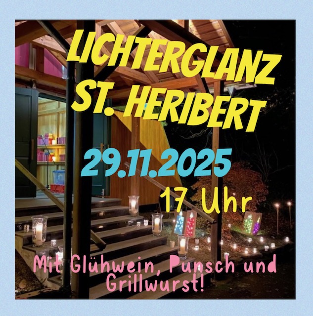 Bald ist es wieder soweit und unsere Vorfreude ist bereits jetzt riesengroß. Am 29.11.2025 verwandelt sich der Vorplatz rund um die Kleinkirche St. Heribert und den Glockenturm wieder in ein wunderschönes Lichtermeer. Während einer Andacht, die von unserem Pfarrer Herrn Lehmann-Pape gehalten wird, werden die Kirche und der Glockenturm zum ersten Mal angeleuchtet. Die Andacht wird in diesem Jahr wieder von den Bläsern der Kantorei, unter der Leitung von Herrn Matthias Müller, musikalisch begleitet. Im Anschluss an die Andacht laden wir Sie/Euch zu einem vorweihnachtlichen Zusammensein bei Glühwein, Punsch und Grillwurst ein. Wir freuen uns auf nette Begegnungen und Gespräche, sowie einen besinnlichen Einstieg in die diesjährige Adventszeit.